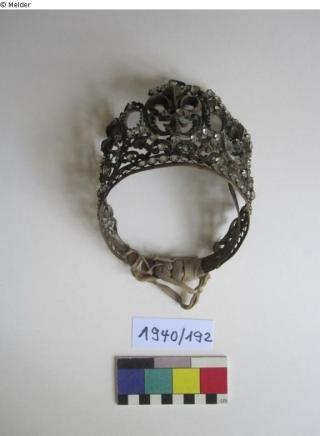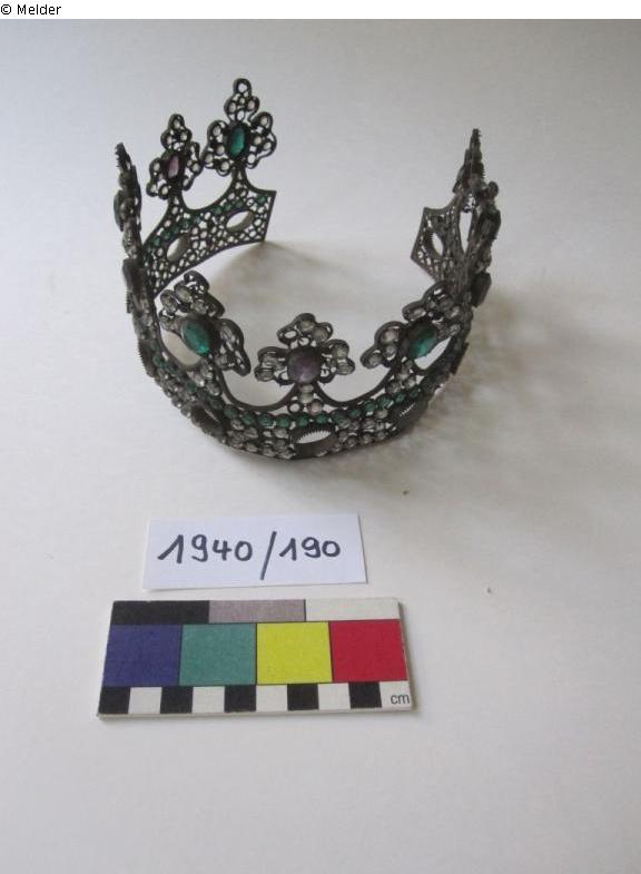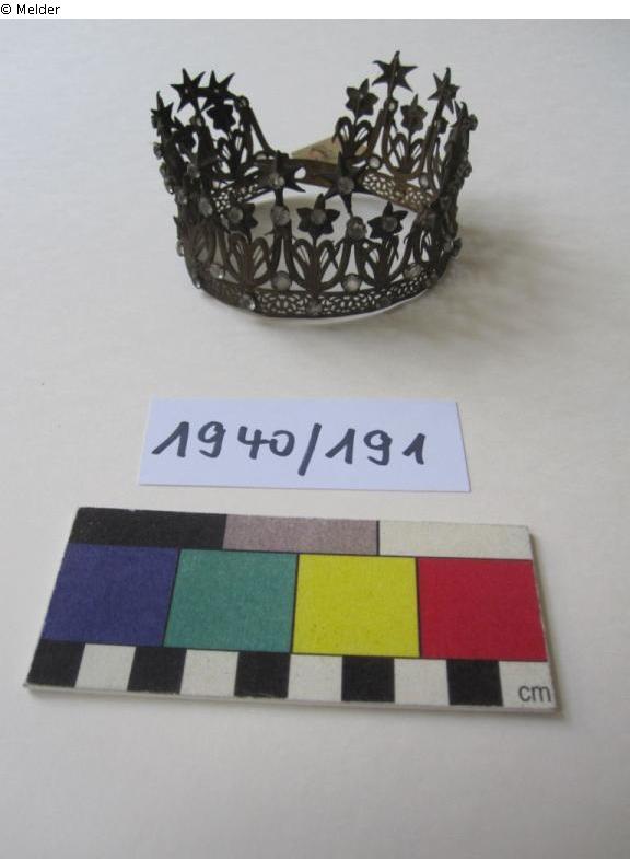 Die Kronen bzw. Diademe sind aus Eisen gefertigt und mit weißen und bunten Glassteinen verziert. Aufgrund des geringen Durchmessers der Kronen bzw. Diademe könnte es sich um Schmuck für eine Heiligenfigur handeln. Solche Votivgaben wurden seit dem Mittelalter für Marien- und Heiligenfiguren gestiftet. Meist sind diese jedoch weitaus prunkvoller im Material und mit einer christlichen Symbolik, z.B. Kreuzen, versehen. Bei diesen Objekten fehlen christliche Zeichen. Die genaue Funktion konnte daher noch nicht abschließend geklärt werden. Auch eine Verwendung als Brautkrone ist möglich.