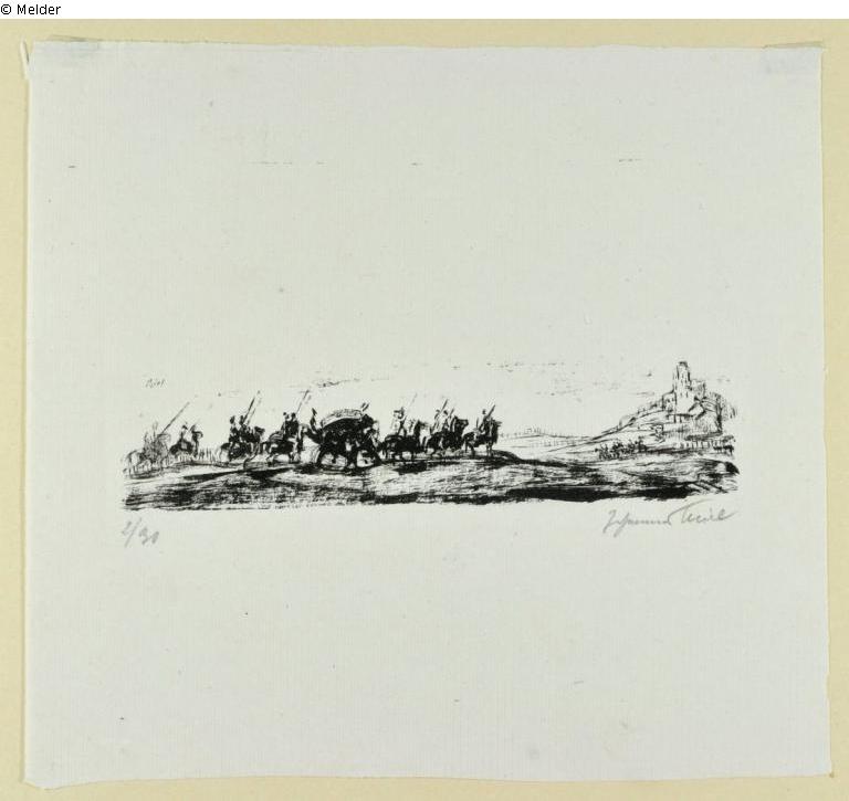 Kutsche mit bewaffneten Reitern vor einer Burg, Ex. 2/30