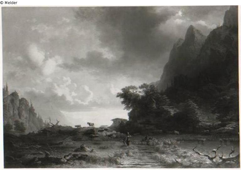 Rechts der Wendelstein vor einem Weiher aufsteigend. Auf dem Weg nach vorn, Bäuerin mit Bütte auf dem Kopf und Kind. Links gegen den Himmel zwei Kühe, ganz Links Felsen.
