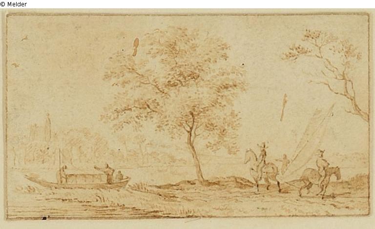 Zwei Reiter (v. r.) an einem Flussufer mit Baum, Zwei Kähne auf dem Wasser