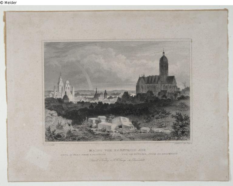 Bez. l. u.: "Gez. v. L. Lange", r. u. "Stahlst. v. Joh. Poppel"; Bildunterschrift: "Mainz vom Kästrich aus / Mainz, as seen from the Kästrich / Vue de Mayence, prise du Kaestrich". Auf der Rückseite Bleistiftnotiz "17 + 22", (entspricht dem Blattmaß der Grafik), Bleistiftnotiz "II" und Etikett rechts unten im Eck mit Bleistiftnotiz "300"; ohne Passepartout.