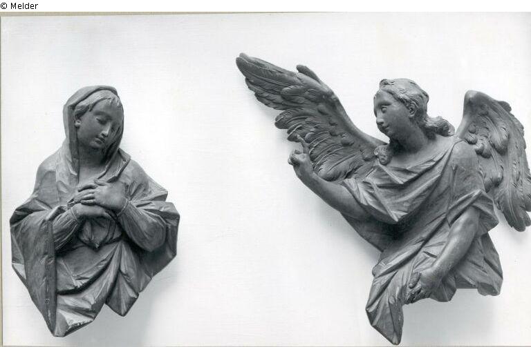 Holz, ungefaßt, Halbfigur; Kopf nach halbrechts geneigt, Hände über der Brust zusammengelegt. Gehört zu Inventarnummer (mü2434/14) Engel einer Verkündigung.