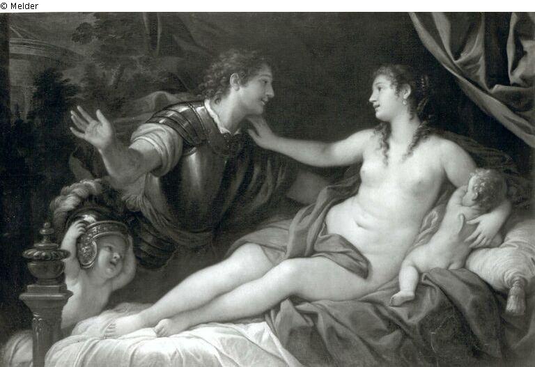 Sujet: Mythologie; Venus erhebt sich gerade u.faßt m.re.Arm an die Schulter des Mars, Mars v.li.mit erhobener Rechter. Putten re. u. li., einer mit Helm.