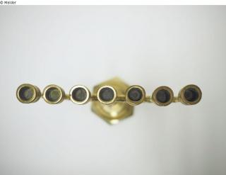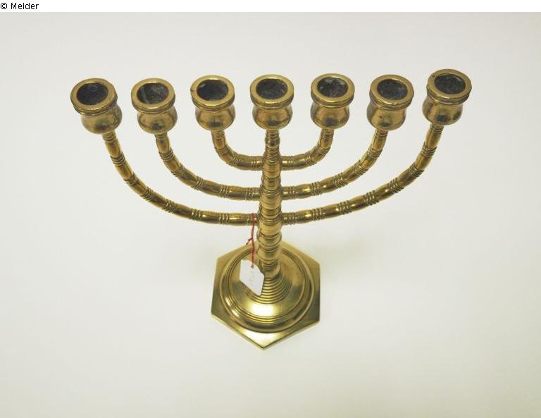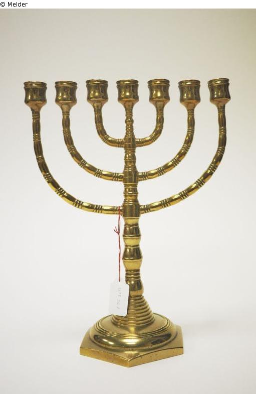 Es ist ein Kerzenständer mit sieben Armen, und bekanntlich eines der meistgenutzten Symbole des Judentums. Diese aus Messing gefertigte Menorah hat einen sechseckigen ansteigenden Sockel mit 11,2 cm Durchmesser, auf dem ein rund getreppter Balusterschaft die Arme des Leuchters trägt. Die Höhe des Leuchters ist 26,5 cm und die Breite 21 cm. Der Leuchter ist leicht beschädigt und zu einer Seite verbogen.