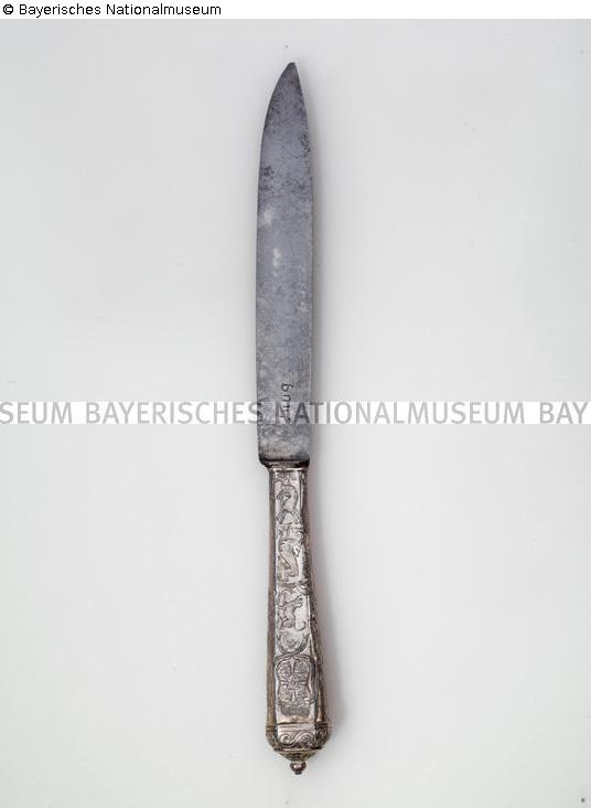 Befund: Auf dem Griff des Messers das Große Staatswappen des dänischen Königshauses. Auf der Klinge (wappenseitig) graviert "baus". Auf der Wappenseite des Griffs (auf dem Abschlussprofil) niederländische Repunze "kleiner Eberkopf" nach rechts. Auf der Klinge (wappenseitig) handschriftlich mit schwarzer Farbe "76/32 (13)" (Inventarnummer des Bayerischen Nationalmuseums).