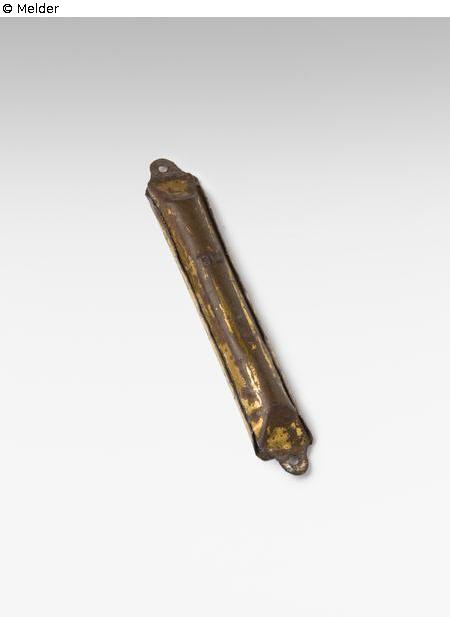 Einfache Mesusa aus leichtem, goldfarbenem Metall zum Aufschieben und mit je einem Loch an jedem Ende und dem hebräischen Buchstabe "Schin" auf der Vorderseite.