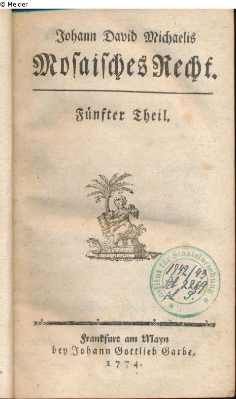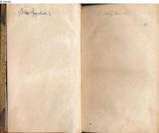 Auf dem Schmutztitel, links, handschriftlicher Besitzervermerk in Tinte, "Benno Wygodzinski", rechts mit Bleistift Vermerk "5. von 6 Bänden". Auf dem Titelblatt Bibliotheksstempel, rund, Dm 3 cm, grün: "Institut für Staatsforschung" mit handschriftlichem Eintrag: "1942/43 | Ab 2269 | L.S."