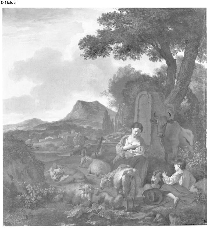 Mutter, Kind und Herde in einer Landschaft