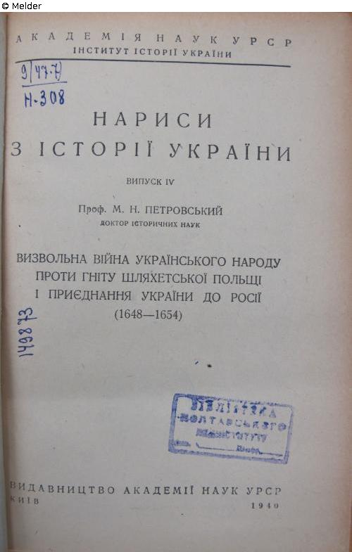 8°, im Deckel Exlibris Dr. Hans Koch, auf Schmutzblatt Vermerk Ostfeldzug 1942, auf Titelblatt Stempel des Pädagogischen Instituts in Poltava sowie Signatur 9/47.7/N-308 und 149873