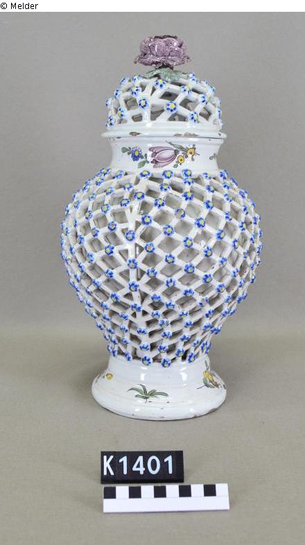 Netz mit plastischen blau-gelben Blümchen; Hals und Fuß ohne Netz mit Blumenornamenten in den Farben Gelb, Mangan, Blau, Grün. Auf dem Netz des Deckels eine plastische manganfarbene Rose mit blau-grünen Blättern und braunem Stiel. Kleine angestoßene Stelle. Marke E K.