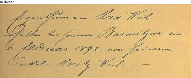 NS-Raubgut (Verdacht) 1.) Geschenk der Stadt Speyer an die Saarpfälzische Landesbibliothek 1941 im Zuge der Deportation der saarpfälzischen Juden am 22.10.1940 nach Gurs (Frankreich) 2.) Autogramm und Notiz zum Geschenk "Eigenthum vom Max Weil erhalten bei seinem Barmitzwe am 6. Februar 1892 von seinem Onkel Moritz Weil": Weil, Max, geb. um 1880 Speyer; seit 1920 als Geschäftsmann in Barcelona; gest. 17.3.1946 ebd.