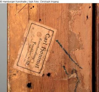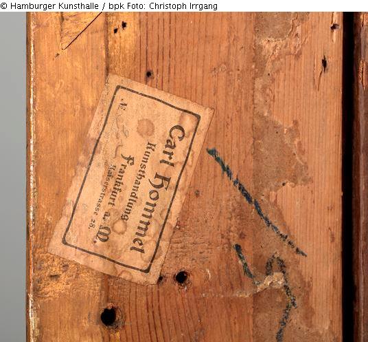 15) unten links, Bleistiftkringel, von Bedeutung?; 16) links, mittig, blaue Ölkreide: „15“ [= siehe 4)]; 17) links, mittig, Aufkleber, weiß in schwarzem Kasten: [1. Zeile (mittig):] „Carl Hommel“, [ 2. Zeile (mittig):] „Kunsthandlung“, [3. Zeile (rechtsbündig):] „Frankfurt a.M.“, [4. Zeile (mittig unter Zeile 3):] „Kaiserstrasse 28.“, [5. Zeile (linksbündig):] „No“ sowie „handschriftliche Annotation: „35“, unten rechts außerdem mit Bleistift hinzugefügt: „600“