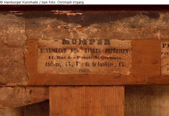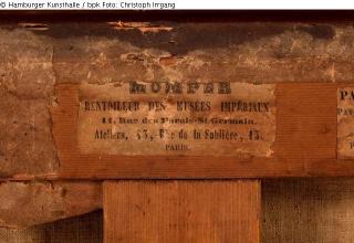 Verso: Werkrückseite: 1) oben links, blaue Ölkreide: „4043“ [= KONTEXT Schlüter]; 2) oben mittig, weißer Aufkleber mit schwarzer Schrift, beschädigt und oberer Teil überklebt, darauf: [1. Zeile:] “MOMPER“, [2. Zeile:] „RENTOILEUR DES MUSÉES IMPÉRIAUX.“ [3. Zeile:] „11, Rue des Marais-St-Germain.“, [4. Zeile:] „Ateliers, 13, Rue de la Sablière, 13.“, [5. Zeile:] „Paris.“; 3) oben rechts mittig, weißer Aufkleber mit schwarzer Schrift, beschädigt, darauf: [1. Zeile:] „Patel (Pierre-Antoine“. 1648 ou 1654-1708.“, [2. Zeile:] „Paysage Classique.“, [3. Zeile:] „Grands arbres laissant par échappées apercevoir des Ruines antiques. Au“, [4. Zeile:] „centre vers la gauche un torrent. A l’avant-plan un satyre poursuit une nym-“, [5. Zeile:] „phe qui se débat…. Et fugit ad salices.“, [6. Zeile:] „Toile, haut 60 cent., larg. 50 cent.“ ; 4) mittig auf Holzkreuz, rote Kreide: „15“ [= mglw. Verweis auf die Tafelnummer, die das Werk in der Auktion Künstlerische Wohnungseinrichtung eines bekannten Großindustriellen, Auktionshaus Edgar Joseph u. Rudolf Preuss, 21.-22.10., Berlin-Charlottenburg, 1929, erhalten hat.]; 5) rechts, rote Farbe/Lack: „365“ [= Nummer des Werks in der Liste Schlüter]; 6) links, blaue Ölkreide: „15“ [= siehe 4)]; 7) mittig auf Holzkreuz, Abdruck eines Prägestempels, rund: „Momper A Paris“