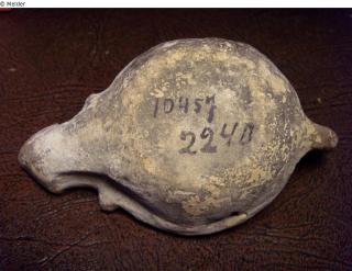 Runde Öllampe; eine Schnauze mit einem Brennloch; Schnauze annähernd drei-eckig; Verbindung von Schnauze zu Körper leicht geschwungen; zwei kurze Dornfortsätze am Übergang von Hals zu Körper; auf dem Spiegel neben der Figur kleines Bohrloch (Einfüllloch); runder Griff;