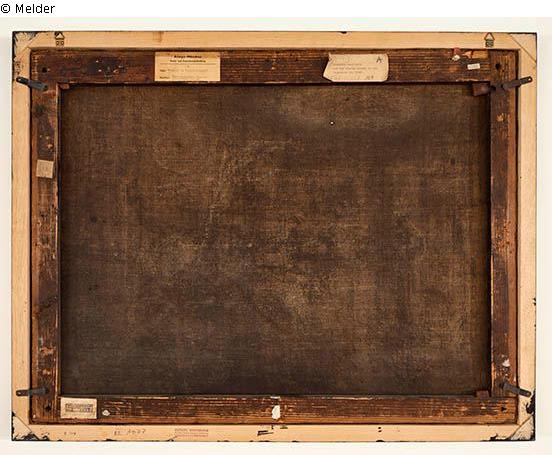 [rechter Keilrahmenschenkel u.:] Reste eines weiß-rosa farbigen Aufklebers [linker Keilrahmenschenkel o.:] quadratischer Aufkleber mit rundem Prägestempel [Adler mit flatternden Flügeln auf (Wappen-?) Schild stehend], im Kreisrund Beschriftung: Dogana…138 [daneben handschriftlich in blauer Kreide:] 21101/1