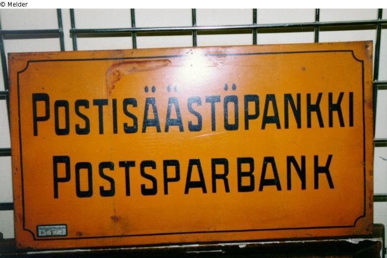 Posthausschild, Finnland, Postsparkasse, "Postisäästäpankki-Postsparbank", finnisch-schwedisches Schild