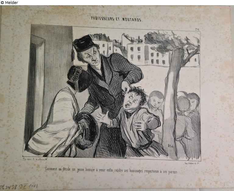 Recto: o.m. im Stein "PROFESSEURS ET MOUTARDS., 26",u.r. im Stein "884", u.l. im Stein "Chez Aubert, Pl. De la Bourse, 29." u.r. im Stein "Imp. d'Aubert & Co." u.m. "Comment on décide un jeune homme à venir enfin rendre ses hommages respectueux à ses parens" u.l. in Blei "No 2438, D V 1463"; Verso: o.l. in Blei "49359".