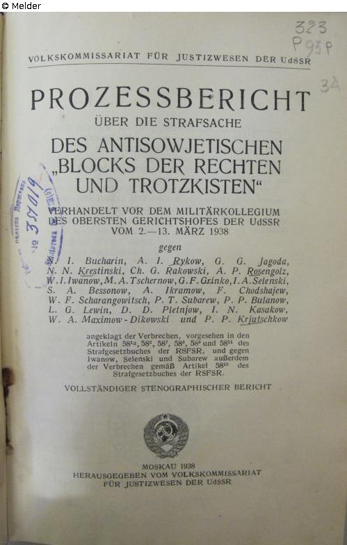 Prozessbericht über die Strafsache des antisowjetischen „Blocks der Rechten und Trotzkisten“. Verhandelt vor dem Militärkollegium des Obersten Gerichtshofes der UdSSR vom 2. - 13. März 1938. Vollständiger stenographischer Bericht