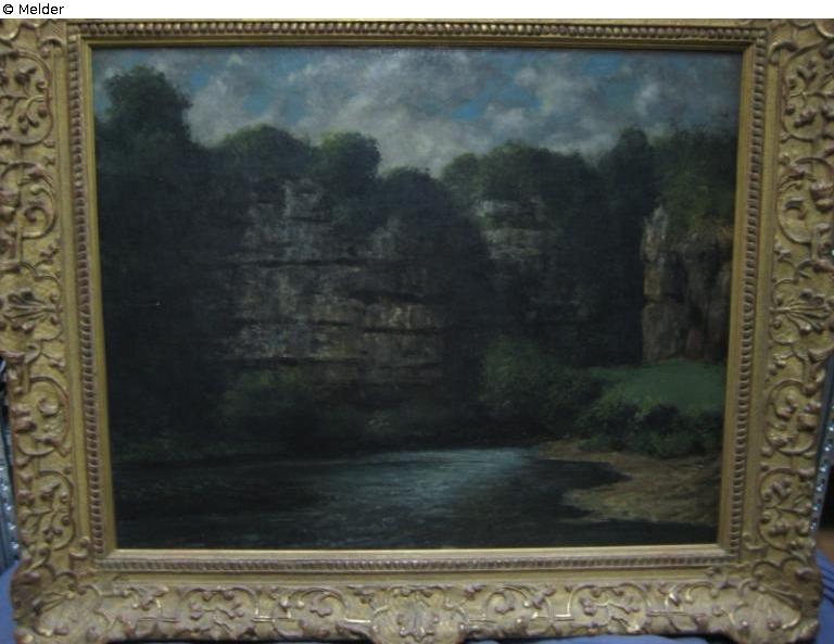 verso, Rahmen, oben rechts in Bleistift: […]16"; oben mittig in Bleistift: "16 J. […?]" und "BPA"; oben rechts in blau: "Wie 1937/16"; in Bleistift: "79"; Mitte rechts in Tinte: "3250 79 [?]"; auf senkrechter Keilrahmenleiste zwei Etikette: “Umkreis d.h. Mitarbeiter von Gustave Courbet (Oranans bei Besançon 1819–La Tour de Peilz, Schweiz, 1877) Jura Landschaft. Laut Epertise von Jean-Jacques Fernier vom Institut Gustave Courbet in Ornans (1. Februar 2006, s. Unterlagen) handelt”; “es sich um das Werk eines Mitarbeiters (wohl Marcel Ordinaire 1848–1896), wie sie Courbet seit Sommer 1872 beschäftigte, mit Korrekturen des Malers. In der Signatur ‘G. Courbet’ ist das t bei der Rentoilage samt einer Partie rechts entfallen. Ohnehin könnte der Namenszug von einem Mitarbeiter eingefügt worden sein. Fernier nennt den Grund, weist auch auf Mängel im Erhaltungszustand des Bildes hin.”