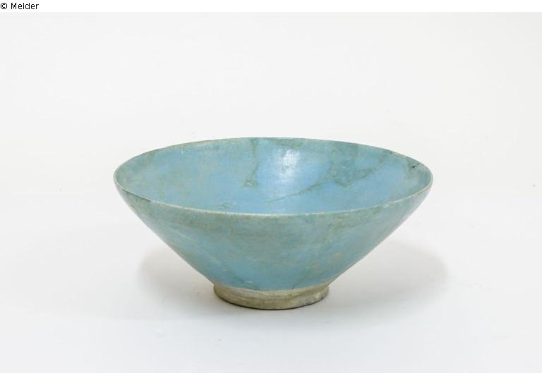 Dünnwandige Schale auf kleinem, niedrigen Fußring. Die Wandung steigt konisch und gerade an, oben ist sie leicht eingezogen. Die Glasur überzieht die gesamte Innenfläche der Schale, die äußere Wandung ist nur im oberen Bereich glasiert, etwa ein Drittel der Wandung ist unglasiert. Am Boden Zahl "86"