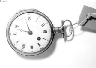 Spindeltaschenuhr. Glattes Silbergehäuse. Weißes Emailleziffernblatt mit römischen schwarzen Ziffern. Minuterie in arabischen Ziffern. Auf der Werksplatine Avance-Retard Angabe. Oberhalb einer bogenförmigen Anbringung von fünf roten Lagersteinen befindet sich in silber die Darstellung einer Kreuzigungsszene. Das Kreuz trägt die Punzierung FFD. Herstellungsort: Süddeutschland