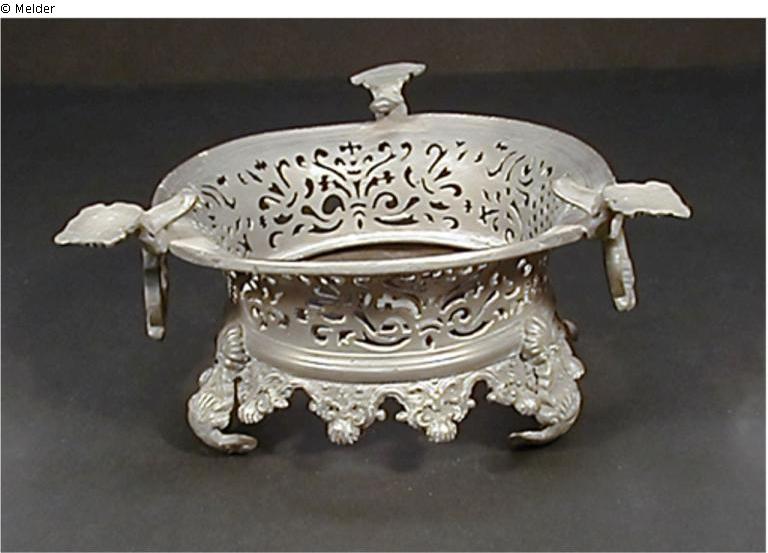 Dieses Stövchen hat einen großen, konkav geformten, dekorativ durchbrochenen Reif. Am unteren Rand befinden sich dreieckige Lappen mit Muschel- und Floraldekor sowie drei mit Muscheldekor verzierte Volutenfüße, darauf ein geschweiftes Fallhenkelpaar mit Muschel- und Floraldekor. Am oberen Rand finden sich drei flache Aufsätze mit Muscheldekor, die über den Reif hinausragen. Es trägt keinerlei Meisterzeichen oder sonstige Markierungen. Aufgrund der häufig wiederkehrenden Formen bei Zinn lässt ist das Stövchen alleine stilistisch dem Barock zuzuordnen, kann jedoch zwischen dem 18. und dem frühren 20. Jahrhundert produziert worden sein.