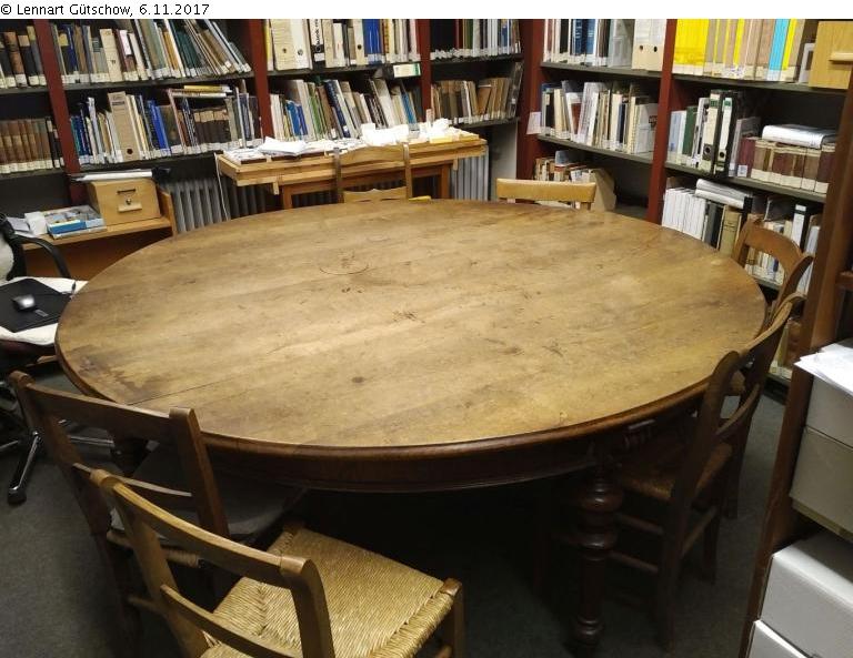 Nach mündlicher Tradition soll der Tisch aus der 1857/59 neu gegründeten Leeraner Freimaurer-Loge "Georg zur wahren Brudertreue" stammen, die 1934 zwangsweise aufgelöst wurde. In der Liste beschlagnahmter Vermögen, der Verlustliste oder in dem Restitutionsgesuch der 1947 wiedergegründeten Loge (NLA Aurich, Rep. 16/1, Nr. 992 (Einziehung von Vermögen staatsfeindlicher Organisationen), Nr. 999 (Auflösung der Freimaurer-Logen) und Rep. 107, Nr. 2184 zum Grundstück und Rep. 252, Nr. 2357 zum finanziellen Schadensersatz der Loge) wird der Tisch nicht erwähnt.