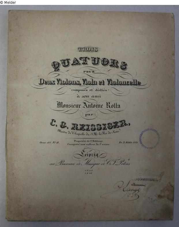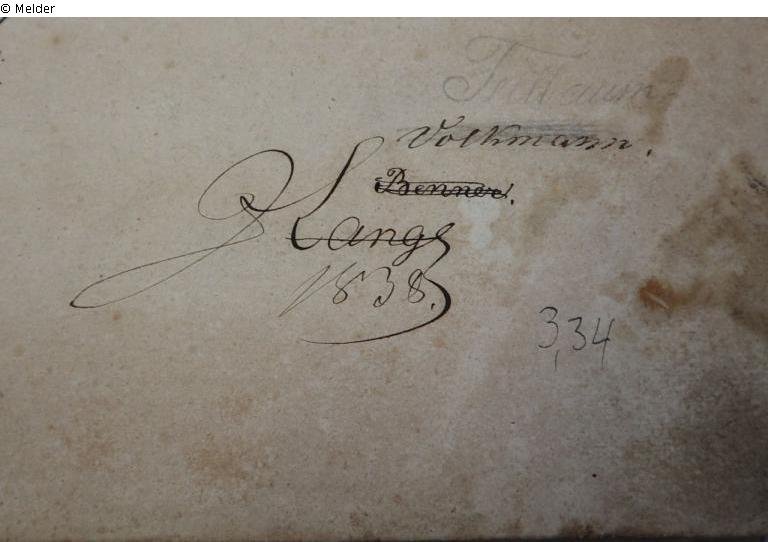 Autogramm: "[G] Lang 1838" (durchgestrichen); Autogramm: "Benner" (durchgestrichen), Autogramm: "Volkmann" (durchgestrichen); Autogramm: "Fellbaum"; Rundstempel: "Musikwissenschaftliches Institut der Universität Köln"; Stempel: "Inventar-Nr."; dahinter handschriftlich ergänzt: "8,328";