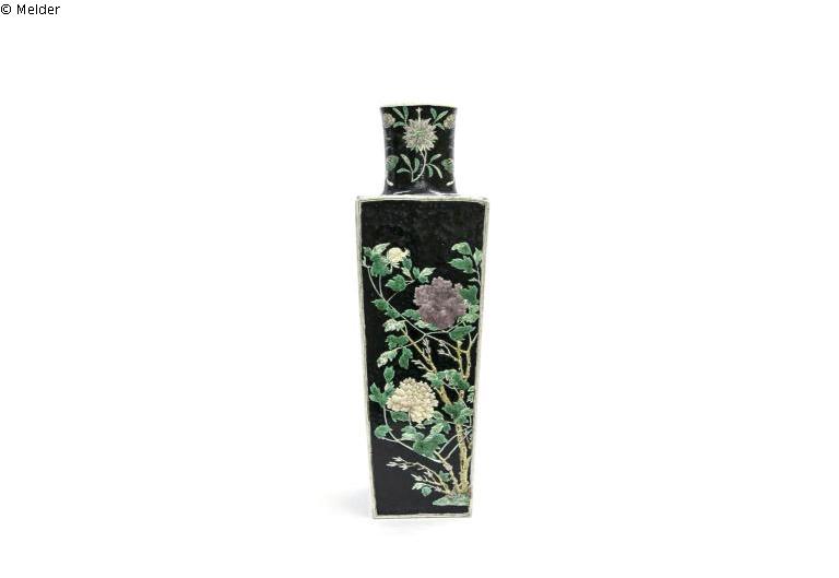 Schwarz (auf dem unglasierten Scherben), darüber grünes Email; zwei verschiedene Grün, Gelb, Violett, Blau, farbloses Email (über dem unglasierten Scherben). Im Inneren gräulich weiße, transparente Glasur; Auf allen vier Seiten Blumen des Jahreszyklus: Pflaume, Päonie, Chrysantheme und Lotos. Auf dem Hals Schmetterlinge und stilisierte Granatapfelblüte oder Lotos; Unter dem Boden in einer viereckigen Aussparung Unterglasur in Blau: Marke: Artemisia-Blatt