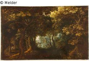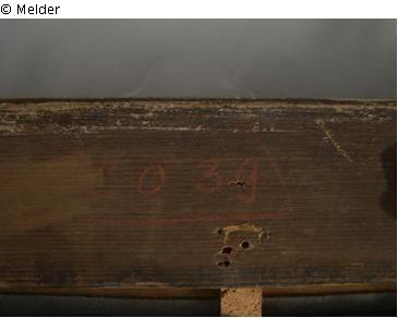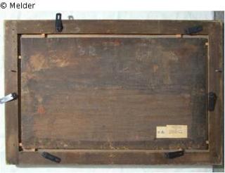 Rechts unten befinden sich zwei Papieraufkleber mit Angaben zum Objekt und zu dessen Standort im Depot („Gemäldegalerie Wiesbaden, Vinckeboons, David, Waldlandschaft, Inv. Nr. 563; M 14“ und „K1 B3“