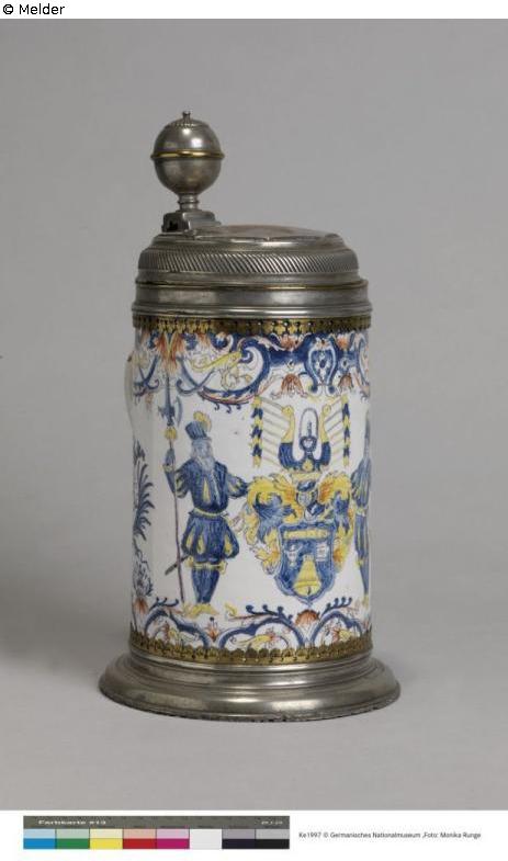 Großer zylindrischer Henkelkrug aus Dorotheenthaler Fayence. Bemalt in Scharffeuerfarben. Auf der Vorderseite halten 2 stehende Landsknechte das Wappen der Rotgießer (mit Glocke und Kanonenrohr). Links und rechts davon gekrönte Medaillons mit Spiegelmonogramm 1719 und Vogel. 2 Randfriese aus reichem Laub- und bandelwerk. Zinnmontierung. Auf dem Deckel eingelegt ein siebenzackiger Stern aus Messing und Kupfer. Am Boden 3 Zinnmarken.