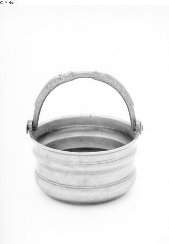 Der zylindrische Korpus ist durch Wulstringe und gravierte Ringe gegliedert. Auf dem Rand sitzen Ösen auf, durch die der Bügelhenkel in Form zweier aufeinander zu springender Fische geführt ist. Markierungen in schwarzer Schrift auf der Objektunterseite: "1687" (darunter:) "mg", "K 590" (darunter:) "KD".