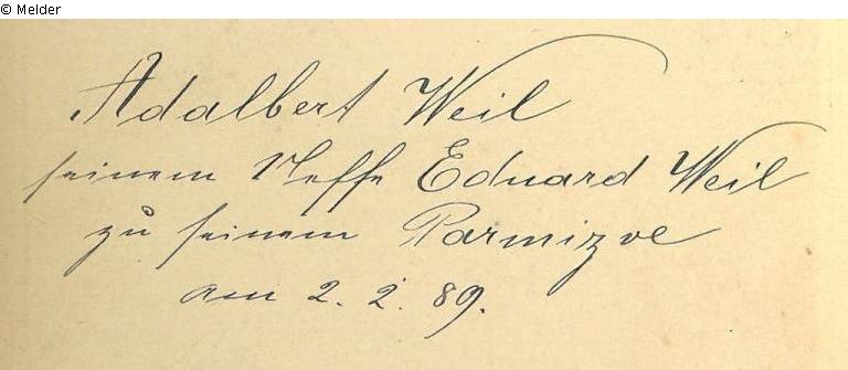 NS-Raubgut 1.) Geschenk der Stadt Speyer an die Saarpfälzische Landesbibliothek 1941 im Zuge der Deportation der saarpfälzischen Juden am 22.10.1940 nach Gurs (Frankreich) 2.) Widmung "Adalbert Weil seinem Neffe Eduard Weil zu seinem Parmizve am 2.2.89": Weil, Eduard, geb. 24.2.1876 in Speyer; 1940 Deportation nach Gurs; 1941 Emigration in die USA; verst. am 29.1.1957 in New York; Vater von Kurt und Liselotte Weil