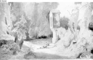 restituiert Suchmeldung Felsenschlucht mit ruhendem Wanderer (Waldlandschaft mit Betsäule) Hersteller/Künstler:in Blechen, Karl Objektart Zeichnung Material / TechnikBleistift ; Farbe grau ; Papier / gezeichnet ; laviert...Lost Art-ID414594