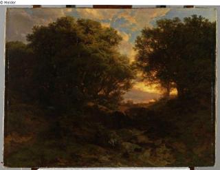 Fundmeldung Abendliche Waldlandschaft Hersteller/Künstler:in Calame, Alexandre Objektart Gemälde Material / TechnikÖl ; Leinwand / gemaltLost Art-ID478444