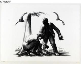 Fundmeldung Zwei Männer mit ausgenommenen jungen Vögeln Hersteller/Künstler:in Dreher, Richard Objektart Druckgrafik Material / TechnikPapier / gedruckt (Lithographie)Lost Art-ID429465