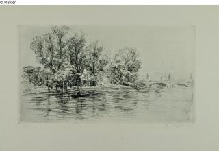 Fundmeldung Flußufer mit Bäumen und Straßenbrücke (im Hintergrund) Hersteller/Künstler:in Epstein, Clara Objektart Druckgrafik Material / TechnikPapier (Bütten) / gedruckt (Radierung)Lost Art-ID319014