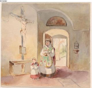 restituiert Fundmeldung Vorhalle einer Kirche mit Kruzifix, Priester und Messknaben Hersteller/Künstler:in Fendi, Peter Objektart Aquarell Material / TechnikPapier ; Wasserfarbe ; Graphit / aquarelliertLost Art-ID578921