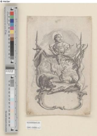 Fundmeldung Kartusche mit Brustbild des Hl. Hubertus, mit Jagdszene und einem leeren Schriftfeld, eingefasst von Jagdemblemen Hersteller/Künstler:in Nilson, Johannes Esaias (in der Art des) Objektart Zeichnung Material / TechnikPapier / gezeichnet (Feder) ; laviertLost Art-ID633306