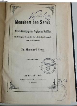 Fundmeldung Menahem ben Saruk Autor:in Gross, Siegmund Verlag Schletter Objektart Buch Lost Art-ID632652