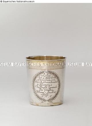 restituiert Fundmeldung Becher mit Widmungsinschrift zur Geburt Hersteller/Künstler:in Treffler, Joh. Christoph (1) Objektart Gefäß Material / TechnikMetall (Silber) / getrieben ; graviert ; vergoldetLost Art-ID578263