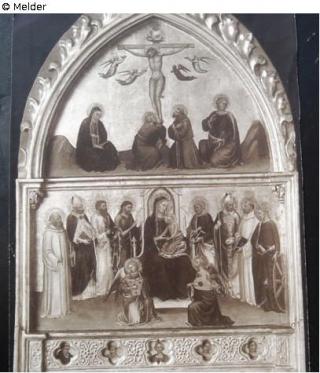 Suchmeldung Altartafel mit thronender Madonna mit Kind zwischen je vier Heiligen, darüber Christus am Kreuz mit Maria, Johannes und hl. Franz Hersteller/Künstler:in Mariotto di Nardo Hersteller/Künstler:in Gaddi, Taddeo (auch) Hersteller/Künstler:in Pietro, Sano di (auch) Objektart Retabel Material / TechnikÖl ; Holz / gemaltLost Art-ID574711