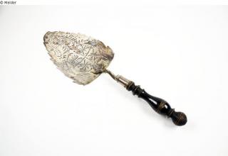Fundmeldung Tortenheber Hersteller/Künstler:in Jeremias Flatt ? (Stuttgart) Objektart Kunsthandwerk / -gewerbe Material / TechnikMetall (Silber) ; Holz / durchbrochenLost Art-ID533608