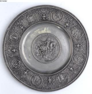 Fundmeldung Teller mit Wappen und Reiterbildnis Eberhard III. Herzog von Württemberg Hersteller/Künstler:in Firma Weygang (Original: Johann Castolus Hunn) Objektart Kunsthandwerk / -gewerbe Material / TechnikMetall (Zinn) / gegossen ; gelötetLost Art-ID578001