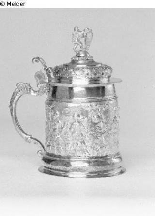 Fundmeldung Deckelhumpen mit Relief Hersteller/Künstler:in Kraer, Jakob Objektart Kunsthandwerk / -gewerbe Material / TechnikMetall (Silber) ; Metall (Gold) / geschmiedetLost Art-ID482192