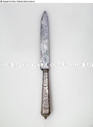 Fundmeldung Messer, Griff mit Jagdszenen und dänischem Königswappen Hersteller/Künstler:in Baus, Johann Peter / Baus, Peter Daniel Objektart Kunsthandwerk / -gewerbe Material / TechnikMetall (Silber) ; Metall (Eisen) / graviertLost Art-ID570400