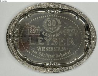 Fundmeldung Tablett: 30 Jahre Kaufhaus Leyser Hersteller/Künstler:in Unbekannt Objektart Kunsthandwerk / -gewerbe Material / TechnikMetall (Stahlblech) / graviert ; vernickeltLost Art-ID618196