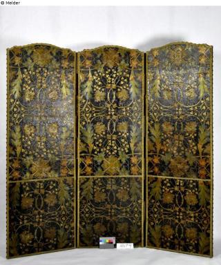 Fundmeldung Paravent mit Goldledertapete mit Rankenwerk Hersteller/Künstler:in Unbekannt (Frankreich?) Objektart Kunsthandwerk / -gewerbe Material / TechnikLeder gold ; Lack gold ; Lüsterfarbe rot, grün / geprägt...Lost Art-ID620723