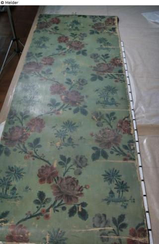Fundmeldung Wachstuchtapete mit Blütenranken in Rot und Blau auf Hellgrün als Chinoiserie Hersteller/Künstler:in Unbekannt Objektart Kunsthandwerk / -gewerbe Material / TechnikTextilLost Art-ID620729