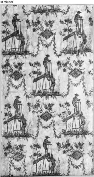 Fundmeldung Rapporttapete, Männer beim Holzsägen, Blau und Rot auf Weiß Hersteller/Künstler:in Unbekannt (Frankreich) Objektart Kunsthandwerk / -gewerbe Material / TechnikPapier / gedruckt (Handdruck)Lost Art-ID620734